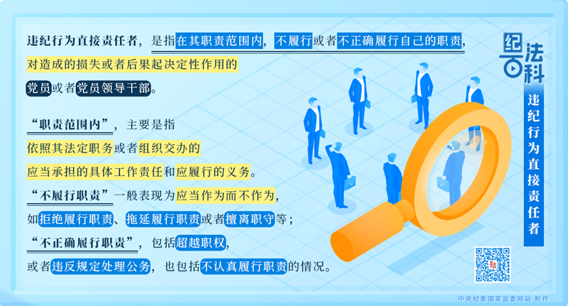 違紀(jì)行為直接責(zé)任者,是指在其職責(zé)范圍內(nèi),不履行或者不正確履行自己的職責(zé),對(duì)造成的損失或者后果起決定性作用的黨員或者黨員領(lǐng)導(dǎo)干部。