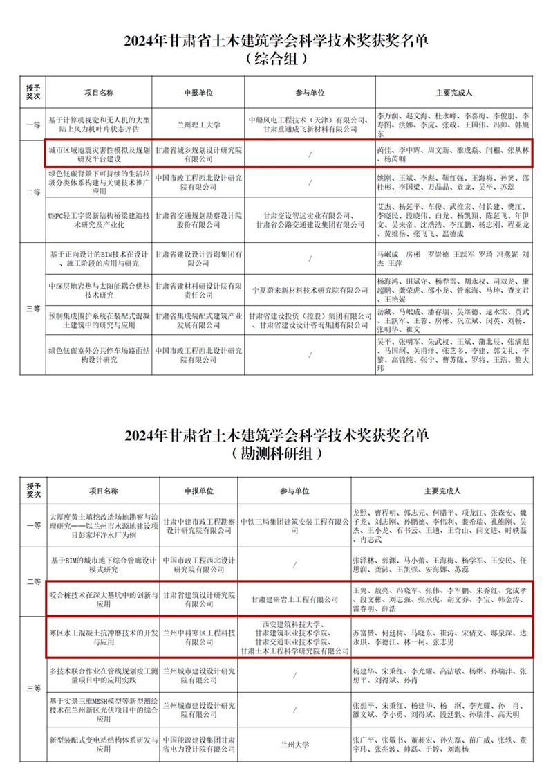 近日,2024年甘肅省土木建筑學(xué)會(huì)科學(xué)技術(shù)獎(jiǎng)獲獎(jiǎng)結(jié)果公布,甘肅工程咨詢集團(tuán)斬獲多項(xiàng)榮譽(yù)。其中,省建筑設(shè)計(jì)院申報(bào)的《咬合樁技術(shù)在深大基坑中的創(chuàng)新與應(yīng)用》項(xiàng)目榮獲“科學(xué)技術(shù)獎(jiǎng)(勘測(cè)科研組)二等獎(jiǎng)”,省城鄉(xiāng)規(guī)劃院申報(bào)的《城市區(qū)域地震災(zāi)害模擬及規(guī)劃研發(fā)平臺(tái)建設(shè)》項(xiàng)目榮獲“科學(xué)技術(shù)獎(jiǎng)(綜合組)二等獎(jiǎng)”,土木工程院參與的《寒區(qū)水工混凝土抗沖磨技術(shù)的開(kāi)發(fā)與應(yīng)用》項(xiàng)目榮獲“科學(xué)技術(shù)獎(jiǎng)(勘測(cè)科研組)三等獎(jiǎng)”。省建筑設(shè)計(jì)院、省城鄉(xiāng)規(guī)劃院4人分別榮獲“科技貢獻(xiàn)獎(jiǎng)”“科技英才獎(jiǎng)”“科技貢獻(xiàn)獎(jiǎng)”“優(yōu)秀總工程師獎(jiǎng)”等榮譽(yù)稱號(hào)。