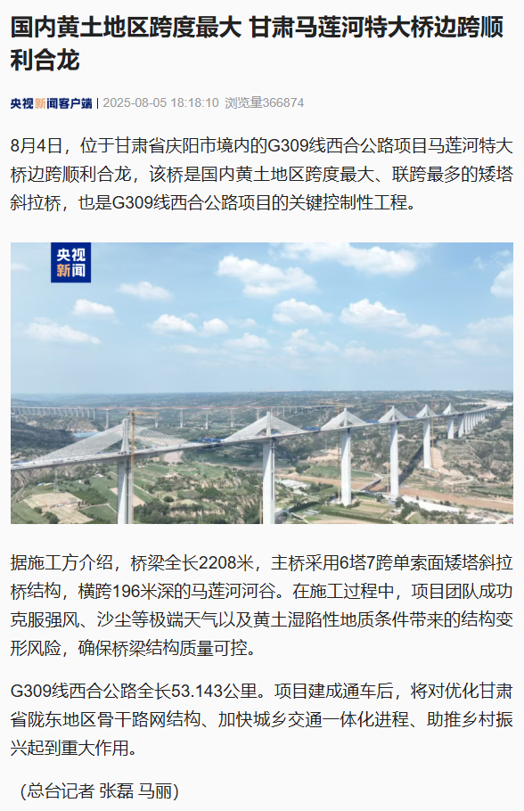 近日,由甘肅工程咨詢集團旗下省交通監(jiān)理公司承監(jiān)的G309線西合公路項目建設取得重大進展——馬蓮河特大橋邊跨順利合龍。項目建成后,將進一步完善區(qū)域路網(wǎng)結(jié)構,對促進慶陽地區(qū)經(jīng)濟社會發(fā)展具有重要意義。
