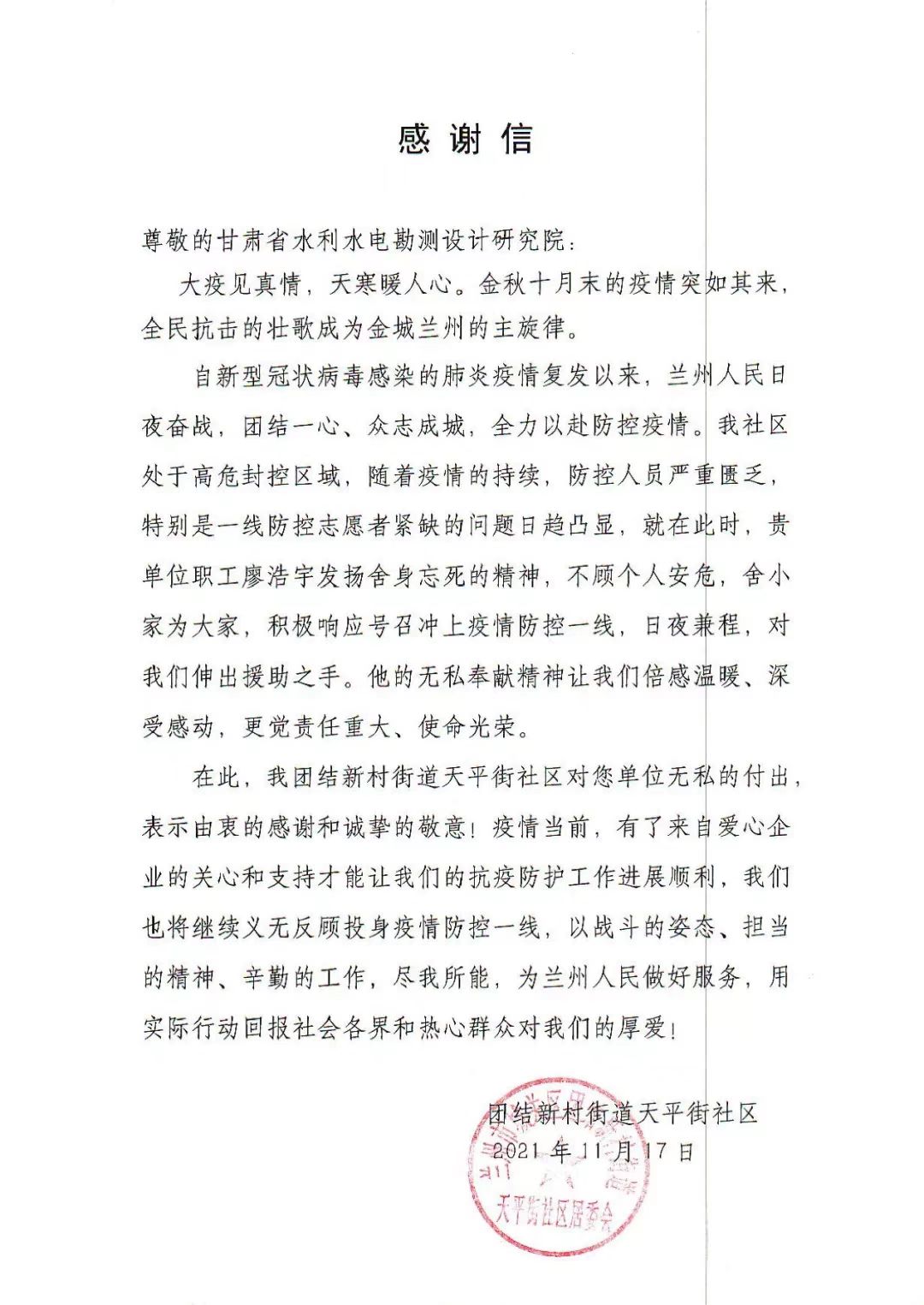 近日,水電設(shè)計院收到中志協(xié)蘭州服務(wù)隊和團(tuán)結(jié)新村街道天平街社區(qū)發(fā)來的感謝信。信中對水電設(shè)計院規(guī)劃院員工廖浩宇在此次疫情發(fā)生后,主動請纓參加疫情防控服務(wù)工作,甘當(dāng)疫情防控最美逆行者,持續(xù)堅持26天志愿者服務(wù)的先進(jìn)事跡表示感謝。