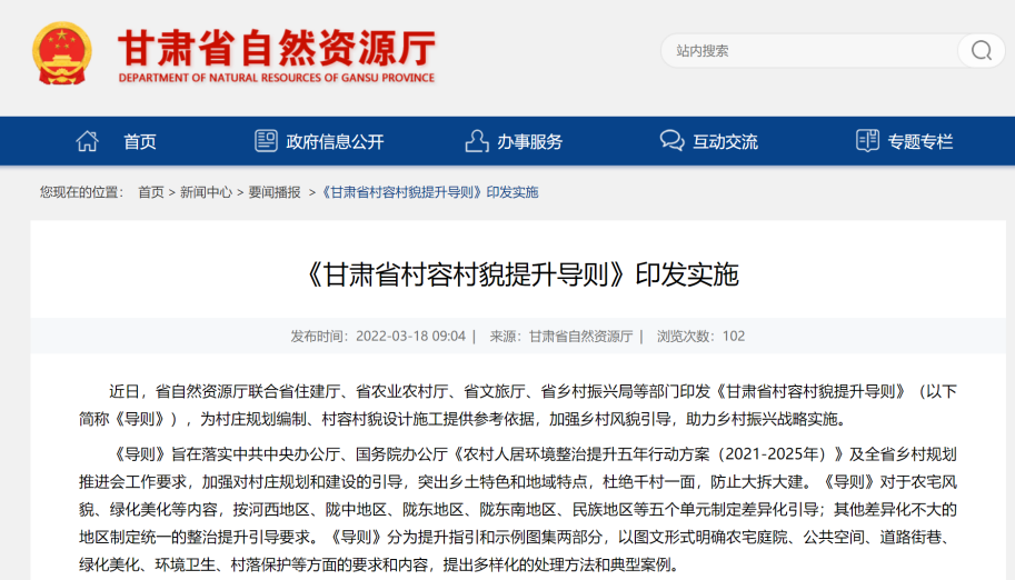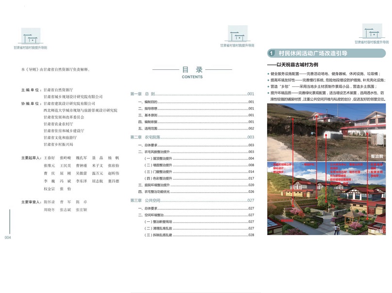 為進一步貫徹落實中共中央辦公廳、國務院辦公廳《農(nóng)村人居環(huán)境整治提升五年行動方案(2021—2025年)》及全省鄉(xiāng)村規(guī)劃推進會精神,由甘肅省城鄉(xiāng)規(guī)劃設計研究院有限公司牽頭,聯(lián)合甘肅省建筑設計研究院有限公司、西北師范大學城市規(guī)劃與旅游景觀設計研究院編制的《甘肅省村容村貌提升導則(試行)》(以下簡稱《導則》),于3月18日由省自然資源廳、省住建廳、省農(nóng)業(yè)農(nóng)村廳、省文旅廳、省鄉(xiāng)村振興局等五部門聯(lián)合印發(fā)。《導則》的發(fā)布為全省村莊規(guī)劃編制工作提供了參考依據(jù),是推進鄉(xiāng)村振興戰(zhàn)略實施的重要抓手,是改善我省農(nóng)村人居環(huán)境、建設美麗甘肅的核心引導,將在規(guī)范我省村容村貌提升、弘揚傳統(tǒng)文化、突出鄉(xiāng)土特色和地域特點,杜絕千村一面,防止大拆大建等方面發(fā)揮重要作用。