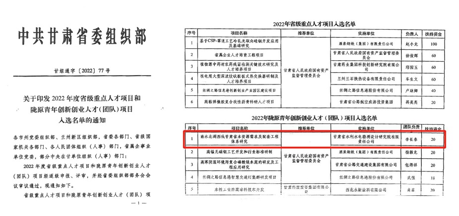 近日,省委組織部印發(fā)了《2022年度省級(jí)重點(diǎn)人才項(xiàng)目和隴原青年創(chuàng)新創(chuàng)業(yè)人才(團(tuán)隊(duì))項(xiàng)目入選名單》,甘肅省水利水電勘測(cè)設(shè)計(jì)研究院有限責(zé)任公司申報(bào)的《南水北調(diào)西線甘肅省水資源需求及配套工程體系研究》成功入選“2022年隴原青年創(chuàng)新創(chuàng)業(yè)人才(團(tuán)隊(duì))項(xiàng)目”,是集團(tuán)公司唯一入選項(xiàng)目。