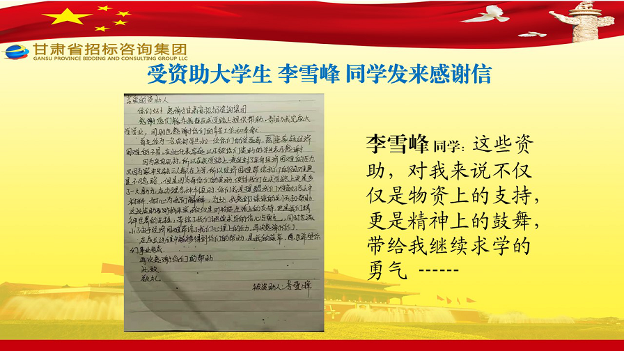近日,張家川縣張棉驛鄉(xiāng)張棉村貧困大學生代表劉國熙、周長斌、李雪峰等向甘肅省招標咨詢集團有限責任公司發(fā)來感謝信,就招標咨詢集團給予學費資助一事表達他們的感激之情。