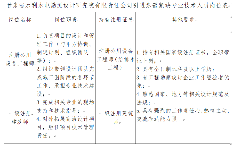 本次引進的具體崗位及資格條件詳見《甘肅省水利水電勘測設(shè)計研究院有限責(zé)任公司引進急需緊缺專業(yè)技術(shù)人員崗位表》(附件1)。