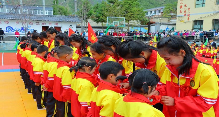 活動現場,在莊嚴激昂的國歌聲中舉行了升國旗儀式。簡單而又隆重的入隊儀式上,鮮紅的隊旗迎風飄揚,隨著入隊隊員名單的宣布,許多一年級的同學成為了光榮的中國少年先鋒隊隊員,并由高年級的少先隊員為他們戴上了鮮艷的紅領巾。隨后,大隊輔導員帶領新隊員宣誓,響亮的呼號聲“時刻準備著”響徹校園上空,集中展示了新時代少先隊員積極向上的精神風貌,全體師生為他們送上最深的祝福。最后,新隊員代表發(fā)言,標準的隊禮、堅定的眼神、稚嫩的聲音表達了最大的決心,號召全體新隊員要在星星火炬的指引下刻苦讀書,從小聽黨話、感黨恩、跟黨走,努力成長為中國特色社會主義事業(yè)建設者和接班人。
