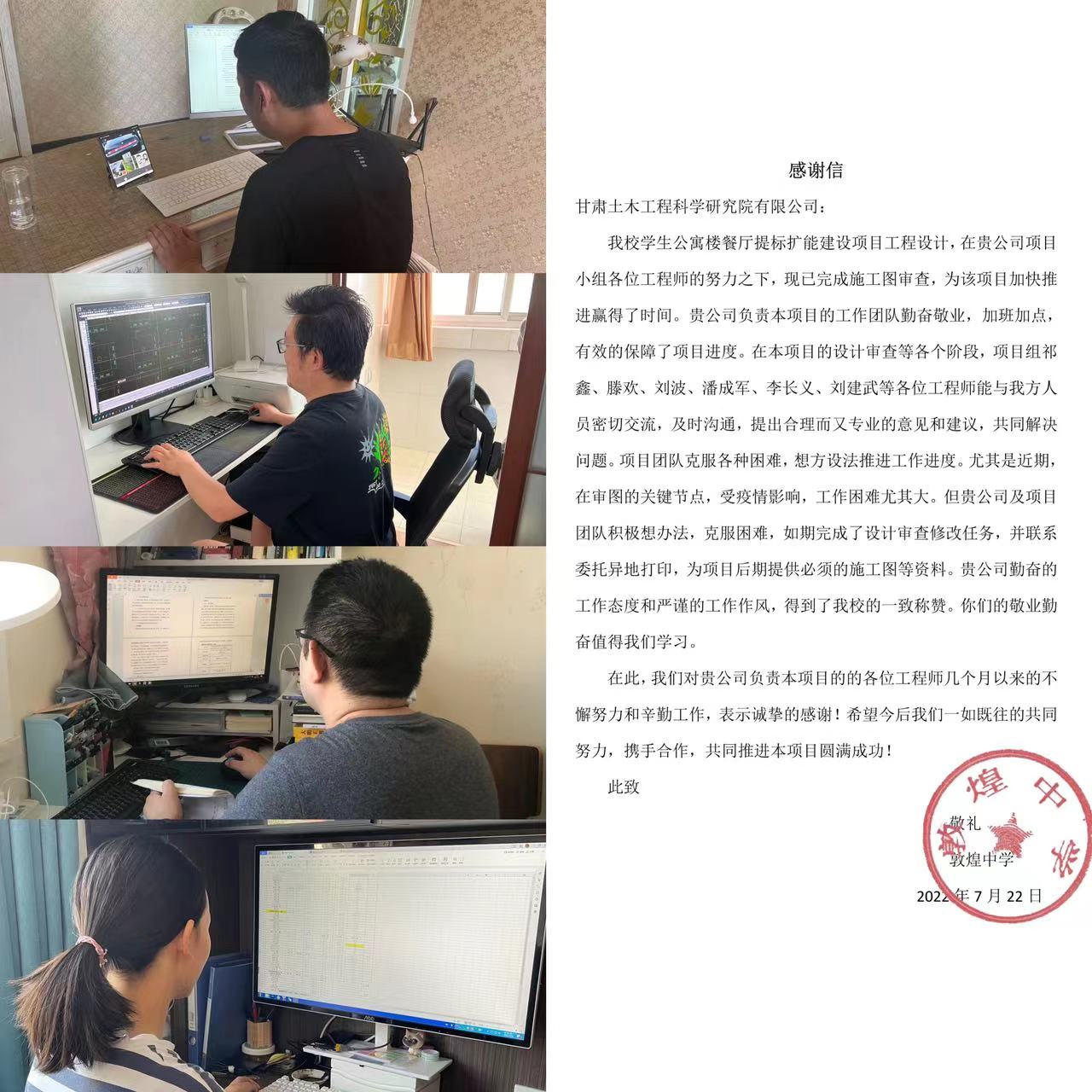 設計一所堅決貫徹土木工程院黨委要求,第一時間部署疫情防控工作。在部門職工居家辦公期間,積極與軟件公司溝通協(xié)調(diào),為所有設計軟件增加了在線使用版,并利用釘釘、微信進行線上溝通,疫情期間完成了2022年華亭市安口鎮(zhèn)老舊小區(qū)住宅樓棚戶區(qū)改造項目施工圖審查、甘肅武威工業(yè)園區(qū)天馬資源開發(fā)有限公司鋼結(jié)構(gòu)標準化廠房建設項目、敦煌中學學生公寓樓餐廳提標擴能建設等項目,得到建設單位的一致好評和致信感謝,極大提升了部門員工技術(shù)創(chuàng)新、全方位服務的工作熱情。
