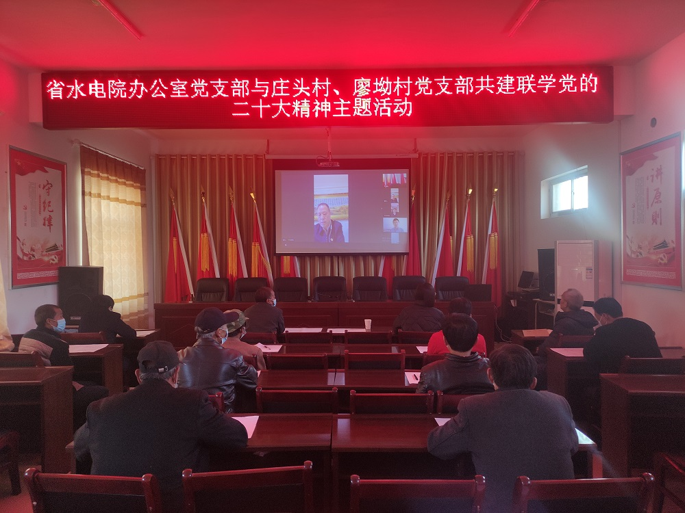 會議以視頻形式召開,兩個幫扶村在線下設(shè)分會場,村黨支部成員在分會場參加。會上,水電設(shè)計院辦公室黨支部書記陳紅寶對黨的二十大精神進(jìn)行了輔導(dǎo)宣講,辦公室黨支部、幫扶工作聯(lián)系人、駐村干部和兩個村黨支部書記、村民黨員代表等9人作了交流發(fā)言。