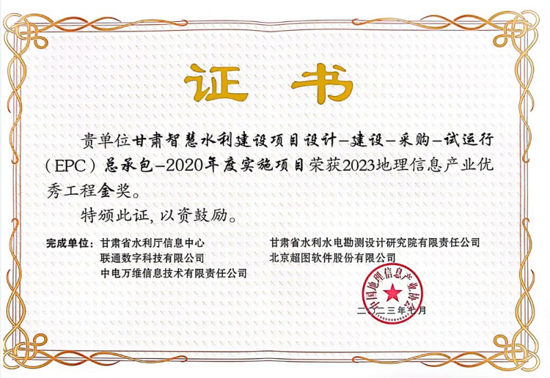近日,第一屆中國(guó)測(cè)繪地理信息大會(huì)在浙江召開(kāi)。由省水利廳實(shí)施、省水電設(shè)計(jì)院參與完成的“甘肅智慧水利建設(shè)項(xiàng)目設(shè)計(jì)-建設(shè)-采購(gòu)-試運(yùn)行(EPC)總承包-2020年度實(shí)施項(xiàng)目”榮獲2023中國(guó)地理信息產(chǎn)業(yè)優(yōu)秀工程金獎(jiǎng)。