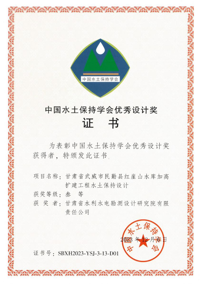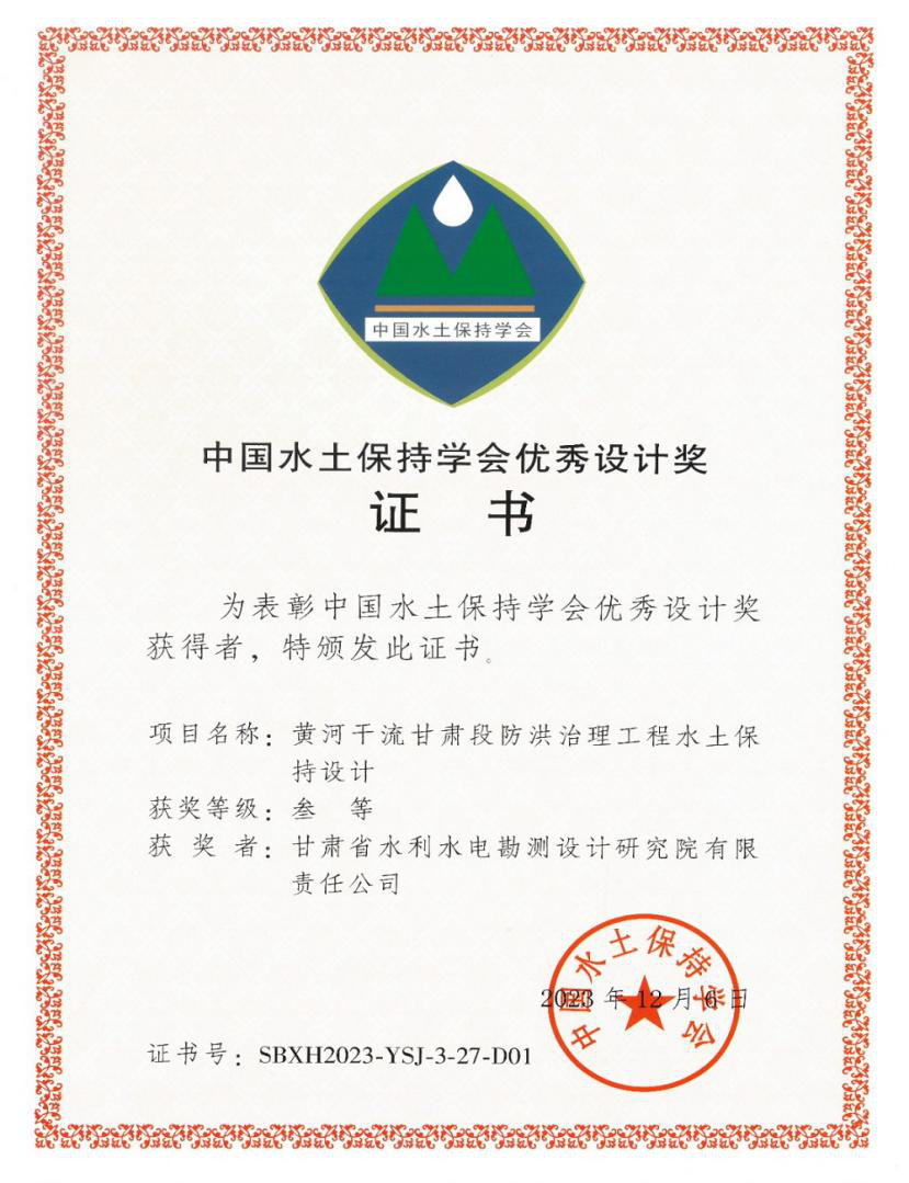 據悉,這是繼《甘肅省引洮供水一期工程水土保持設計》獲第三屆中國水土保持學術大會優(yōu)秀設計二等獎后,再次喜獲此獎項。中國水土保持學術大會制度自2018年建立以來,中國水土保持學會搭建了我國水土保持領域規(guī)模最大、水平最高的學術交流平臺,現(xiàn)已成為中國水土保持學術交流的重要品牌。中國水土保持學會優(yōu)秀設計獎每兩年評選一次,主要獎勵我國在水土保持規(guī)劃與設計領域中技術先進、成效顯著、理念創(chuàng)新的項目成果。