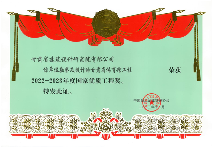 近日,從中國(guó)施工企業(yè)管理協(xié)會(huì)傳來(lái)好消息,由甘肅省工程勘察設(shè)計(jì)大師、省建筑設(shè)計(jì)院總建筑師馮志濤帶領(lǐng)團(tuán)隊(duì)設(shè)計(jì)的甘肅省體育館榮獲“2022-2023年度國(guó)家優(yōu)質(zhì)工程獎(jiǎng)”榮譽(yù)稱(chēng)號(hào)。