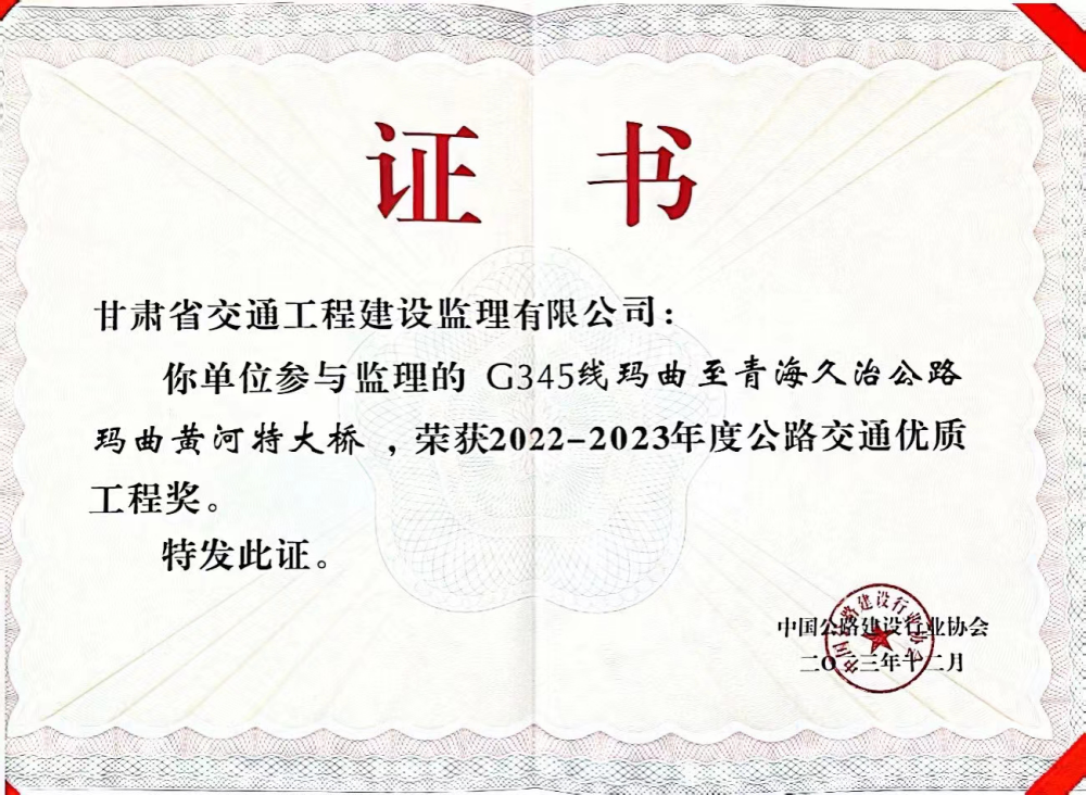 近日,中國公路建設行業(yè)協(xié)會于湖北武漢召開第五屆公路建設高質量大會暨2022-2023年度公路交通優(yōu)質工程獎表彰大會。省交通監(jiān)理公司“代建+監(jiān)理”的G345線瑪曲至青海久治公路瑪曲黃河特大橋榮獲公路交通優(yōu)質工程獎。此次獲獎系公司在兩徽、金阿高速公路之后第三次獲得全國公路交通優(yōu)質工程獎——李春獎。