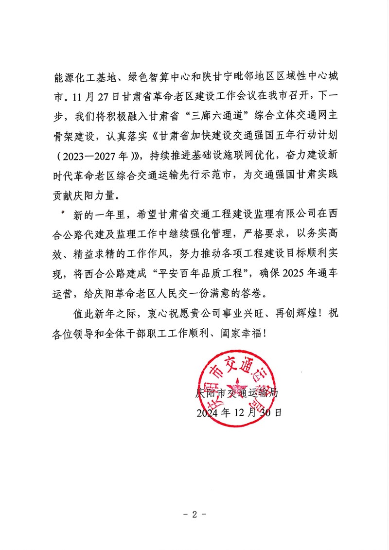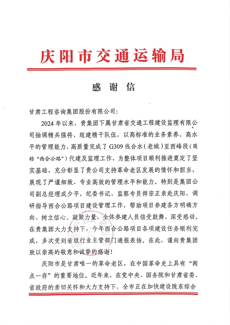 12月30日,甘肅工程咨詢集團(tuán)收到慶陽市交通運輸局的感謝信,向省交通監(jiān)理公司在G309線合水(老城)至西峰段公路項目建設(shè)過程中作出的貢獻(xiàn)表示感謝。