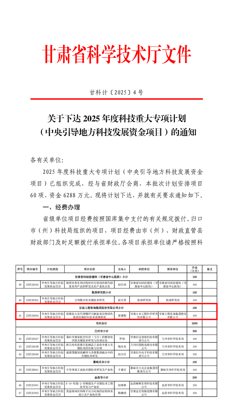 近日,甘肅省科技廳公布了2025年度科技重大專(zhuān)項(xiàng)計(jì)劃(中央引導(dǎo)地方科技發(fā)展資金項(xiàng)目)立項(xiàng)名單,土木工程院主持申報(bào)的“資源化大宗利用煤矸石制備高活性綠色低碳膠凝材料技術(shù)成果轉(zhuǎn)化”項(xiàng)目成功立項(xiàng)。
